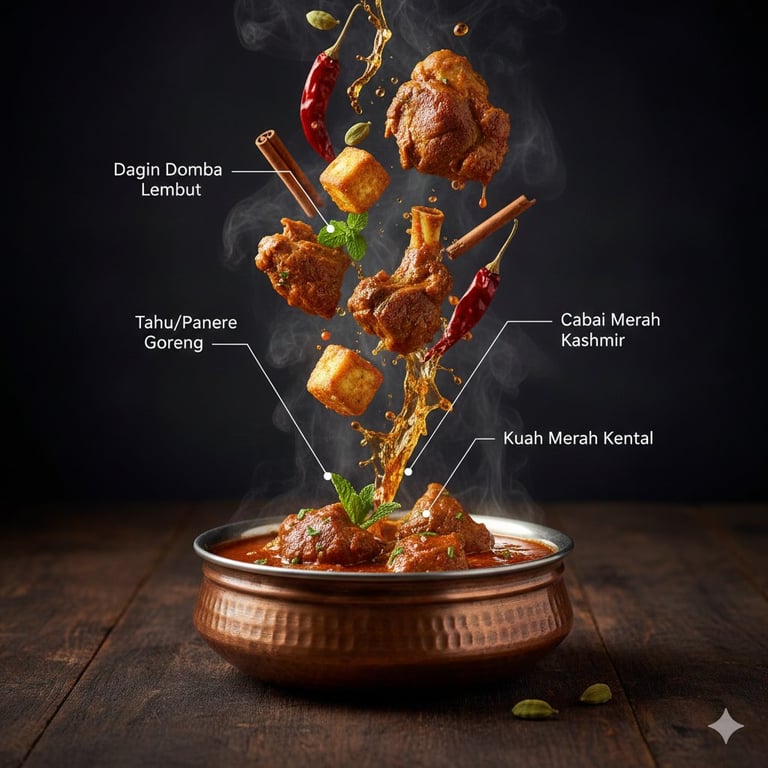 A JSON prompt designed to generate a hyper-realistic, cinematic infographic image of Kashmiri Wazwan cuisine. It features a traditional copper bowl of Rogan Josh with dramatic steam, surrounded by levitating ingredients (mutton, paneer, spices) frozen in motion, suitable for high-end food visualization or educational content.