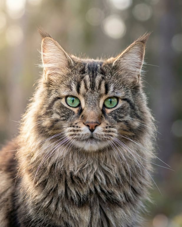 A prompt designed for a photorealism comparison test between different AI models, generating a hyper-realistic close-up portrait of a fluffy Maine Coon cat, specifying detailed fur texture, striking green eyes, and professional camera settings (Canon EOS R5 85mm f/1.2).