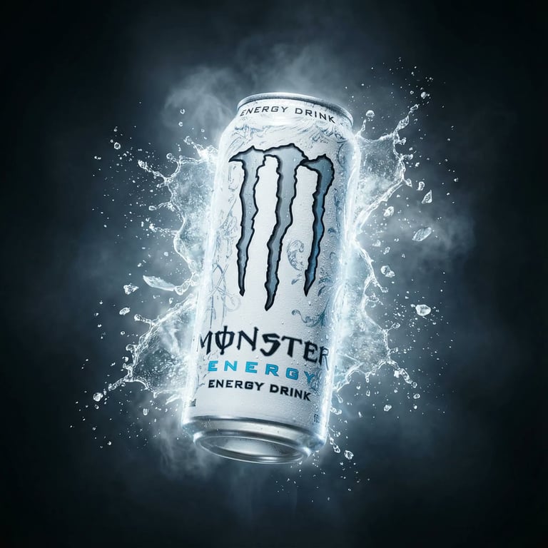 A prompt for generating a hyper-realistic, cinematic product advertisement image for a White Monster Ultra Energy Drink. It focuses on suspending the can mid-air, surrounding it with an explosive, frozen splash of icy water and vapor, using intense studio rim lighting to achieve a high-energy, premium commercial aesthetic.