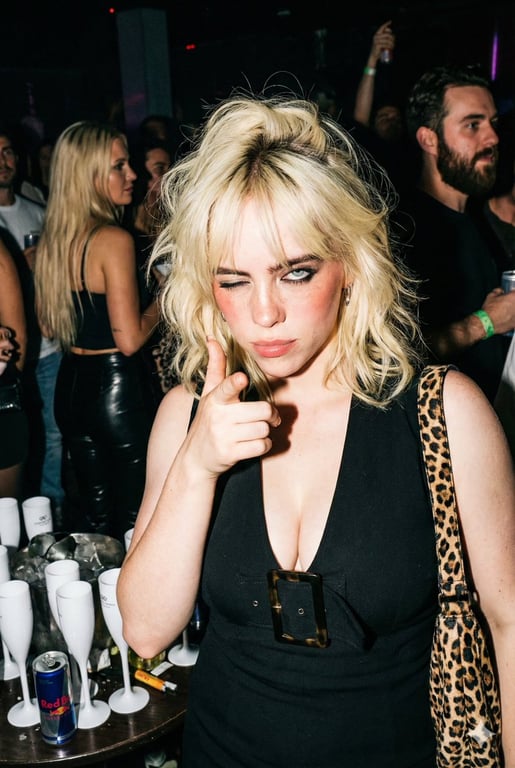 A comprehensive JSON prompt for Gemini Nano Banana Pro designed to generate a hyper-realistic, candid nightlife photograph. It meticulously details the subject (a young woman with copper-red hair, specific attire, and a 'finger gun' pose), the crowded nightclub environment, foreground/background elements, and technical specifications like hard direct flash, high contrast, and 4K resolution to mimic raw paparazzi style.