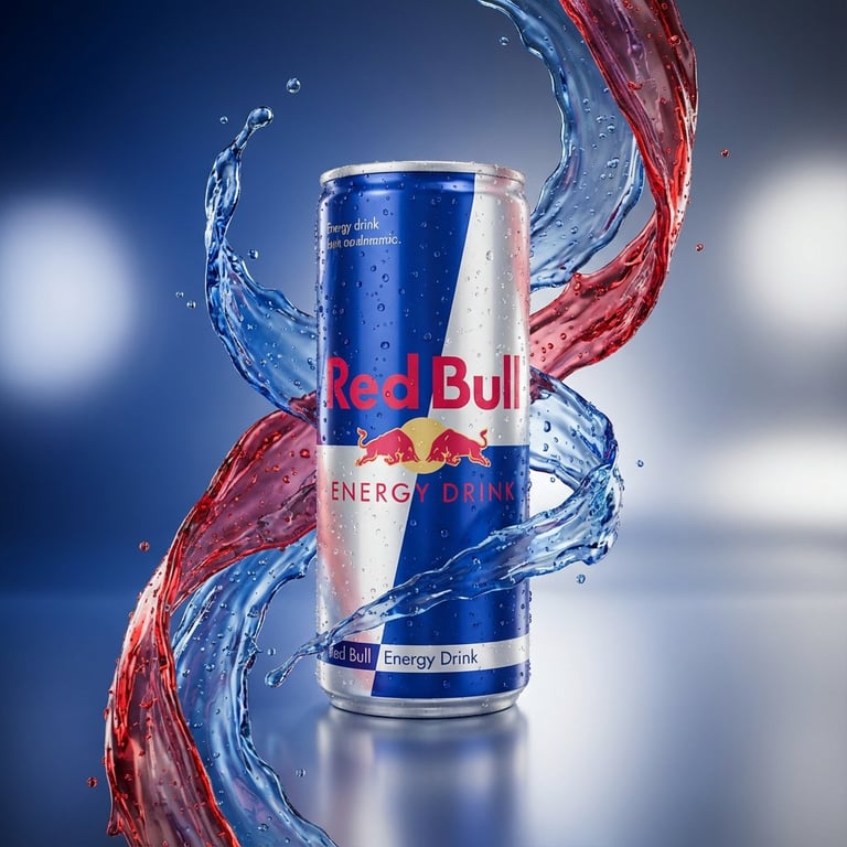 A prompt for generating high-end, professional studio product photography. It focuses on a centered product surrounded by dynamic, swirling liquid splashes, set against a minimalist gradient background that matches the product's branding, emphasizing cinematic lighting and hyper-realistic detail.