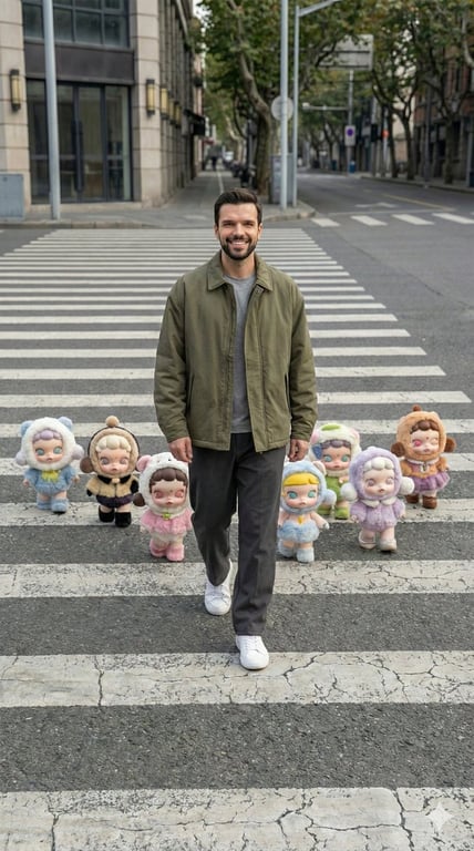 A highly constrained prompt for generating a hyper-realistic, vertical candid street photograph of a young man walking on a zebra crossing, surrounded by Popmart Skullpanda figures. The prompt demands precise matching of camera angle, perspective, and figure placement from a reference image, emphasizing a wide-angle, elevated viewpoint and realistic skin/ground textures.