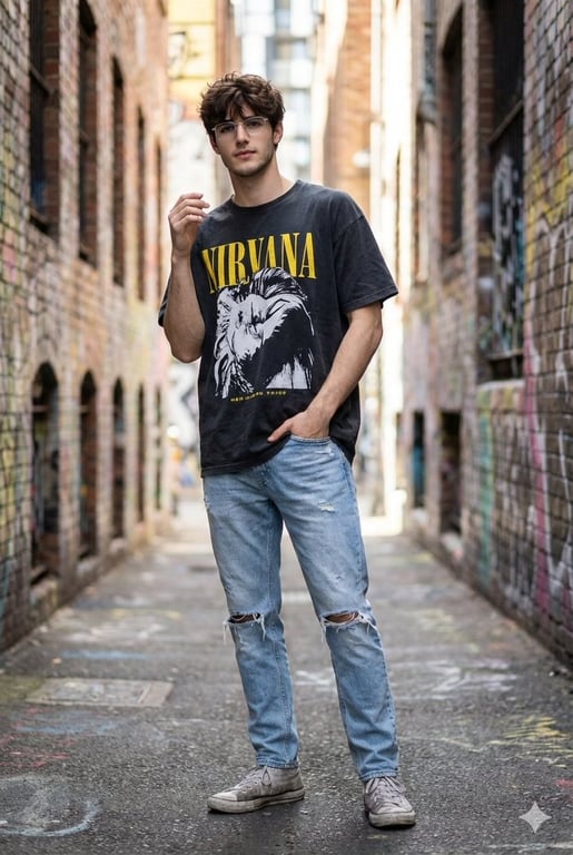 A prompt for generating a hyper-realistic DSLR photograph of a subject standing confidently in a narrow urban alleyway covered in colorful graffiti. It specifies the subject's attire (oversized graphic t-shirt, distressed jeans), pose, and photographic elements like strong depth of field and cinematic bokeh.