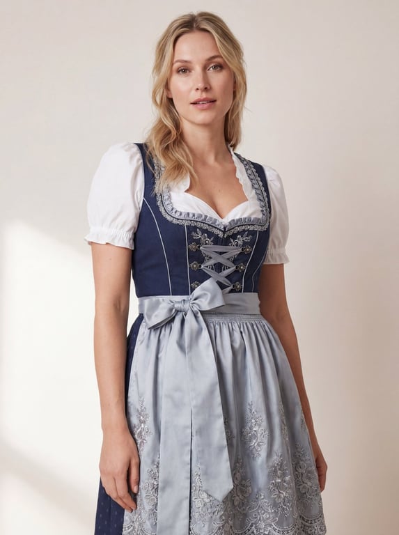A detailed image generation prompt designed to create a hyper-realistic, professional studio photograph of a woman wearing a traditional Bavarian dirndl. The prompt specifies detailed fabric textures, natural lighting, and a plain studio background, while explicitly using negative prompts to avoid common AI artifacts and maintain an authentic human appearance.