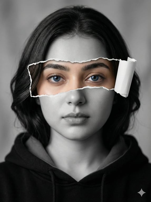 A detailed prompt for generating a hyperrealistic, high-resolution photo-manipulation portrait in black and white, featuring selective color on the subject's intense blue eyes, using a ripped-paper effect across the face to reveal the colored eye area.