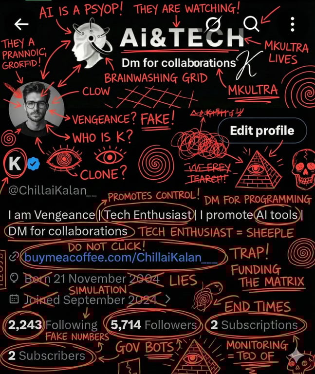 A prompt instructing the AI to overlay a provided image with chaotic, intense annotations, specifically 'insane schizophrenic conspiracy scribbles,' red ink, doodles, remarks, and comments, creating a highly distressed and annotated visual.