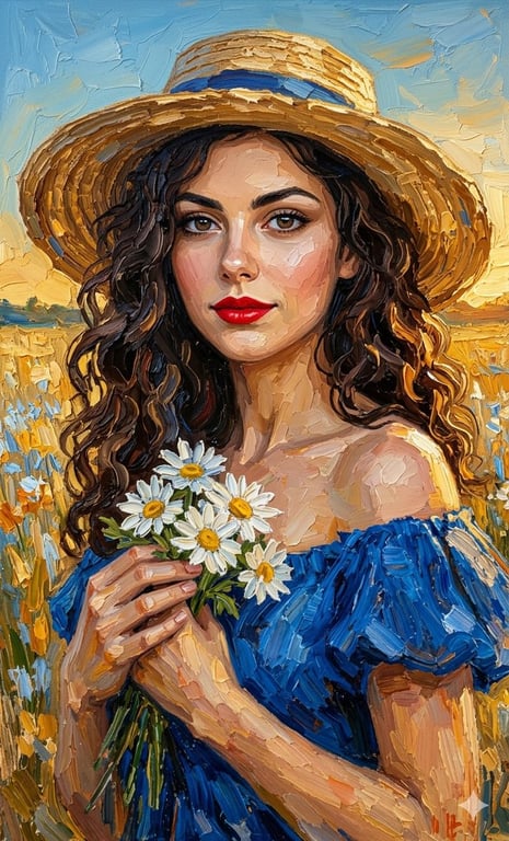 A detailed prompt for generating an impasto oil painting portrait of a young woman based on an uploaded photo, specifying features (red lips, brown hair), attire (straw hat, blue dress), background (golden field, golden-hour light), and texture details (heavy palette knife strokes), using Gemini Nano Banana Pro 2.0.