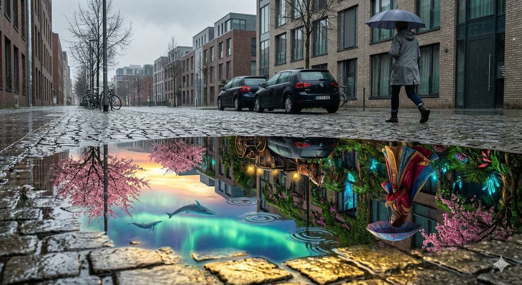 An extremely detailed prompt for Nano Banana 2 to create an image featuring a large street puddle that reflects a completely different, parallel fantasy world instead of the real world above it. It specifies the details, mood, and technical aspects of both the real world and the reflected fantasy world.