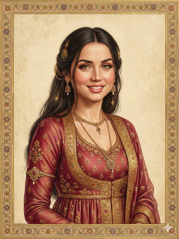 A prompt for generating an illustration in the style of classic Mughal-era Indian miniature painting, using a photo reference for the subject's face and expression. It specifies artistic details like delicate brush strokes, rich pigments, and ornamental borders, transforming a modern photo into museum-quality traditional art.