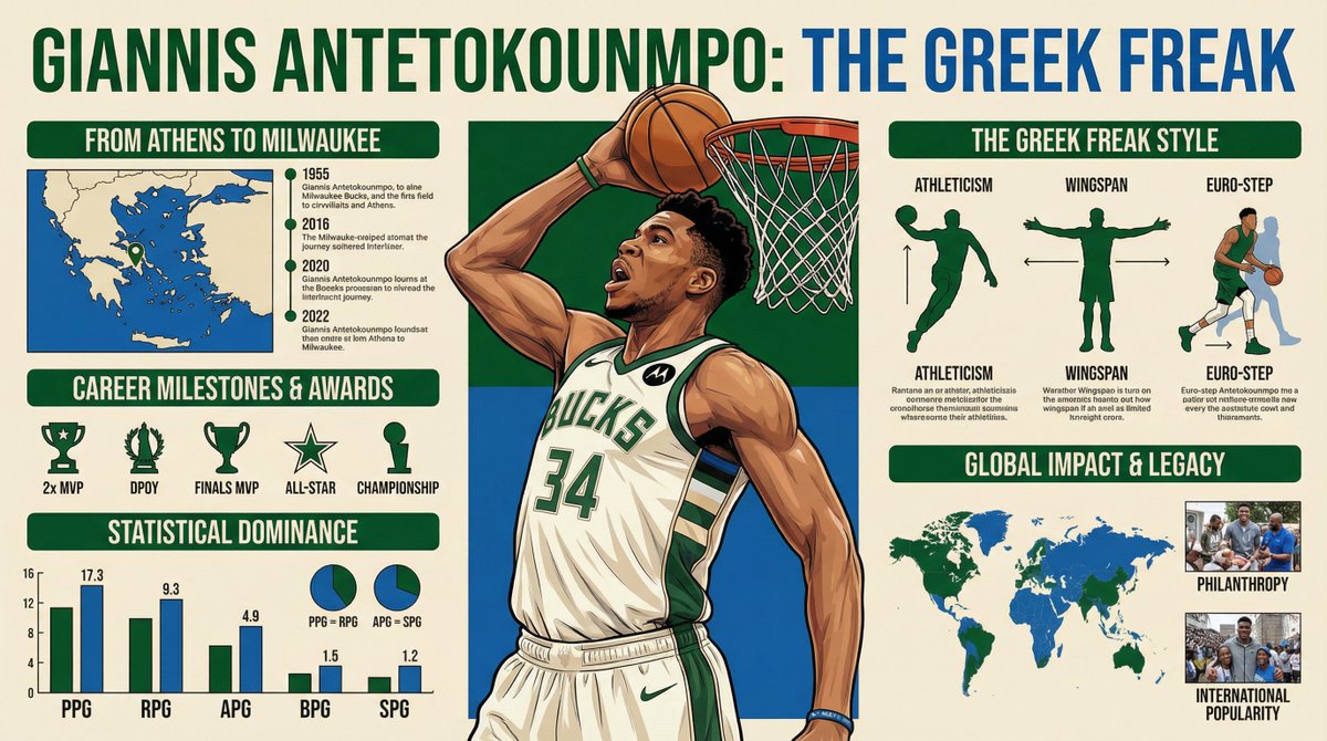 A user asks the AI model to generate an infographic of Giannis Antetokounmpo's career, which is a text-based request for information visualization.