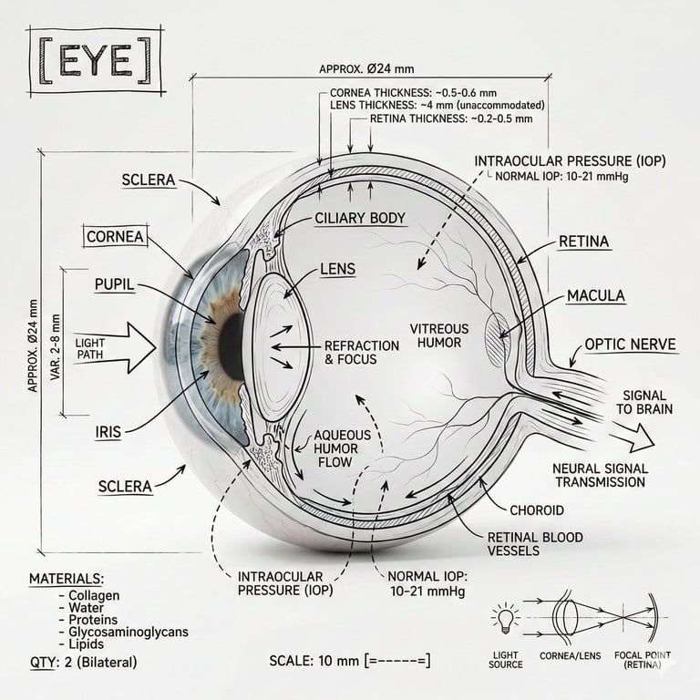 A reusable prompt template for Nano Banana Pro designed to create an infographic image of a specific body part (defaulted to 'Eye'). The prompt instructs the AI to combine a photorealistic render of the object with technical annotation overlays, using black ink line drawings, labels, measurements, and schematic diagrams on a pure white background, aiming for an educational, engineering-manual aesthetic.