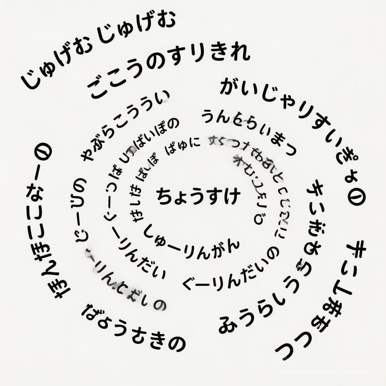 A complex prompt designed to test text generation capabilities, requiring the long Japanese text of the 'Jugemu' story to be arranged in a clockwise spiral starting from the top left, with the final characters centered. This prompt was used to compare Seedream 5.0 and Nano Banana Pro.