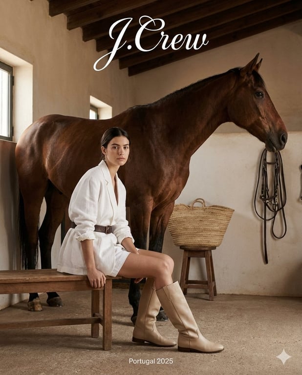 A detailed prompt for a modern rustic fashion editorial shot, featuring a young woman seated on a wooden bench next to a lean brown horse inside a stable. It specifies the clothing (oversized white jacket, white shorts, riding boots), the setting (rustic stable, natural daylight), and includes specific text overlays for branding and location.