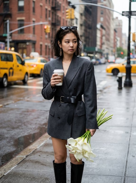 A prompt for generating a cinematic street style editorial photograph of a young Korean woman resembling Blackpink's Jennie on a rainy NYC sidewalk, emphasizing power chic fashion, specific outfit details, and moody lighting.