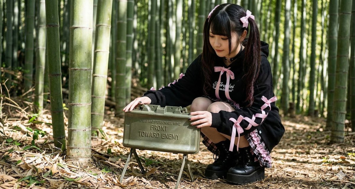 A prompt for the Nano Banana Pro image generator (Gemini 3) to create an image of a 'Jirai-kei' (landmine style) fashion girl holding an M18A1 Claymore landmine in a bamboo forest setting.