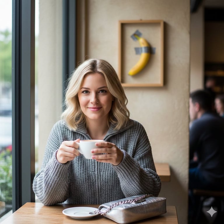 A prompt for Gemini Nano Banana Pro 3.0 generating a realistic lifestyle photograph of a blonde woman at a cafe, with a humorous, surreal element in the background: a banana duct-taped to a wall inside a frame.