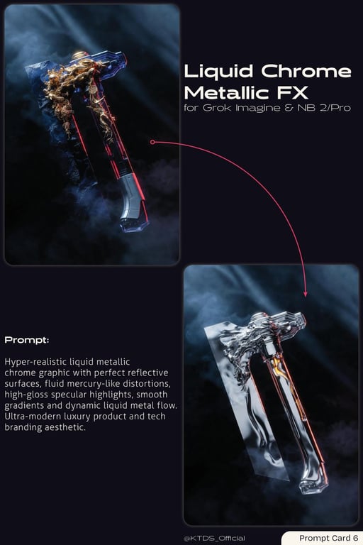 A prompt for generating a hyper-realistic liquid metallic chrome graphic with perfect reflective surfaces, fluid distortions, and high-gloss specular highlights, suitable for modern luxury product branding.