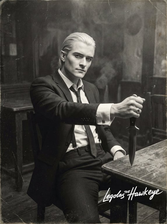 A detailed JSON prompt for Nano Banana Pro to reimagine Aragorn from The Lord of the Rings as a 1930s mobster. The prompt specifies attire (pinstripe suit, fedora), props (Tommy gun), pose, and photography style (old black-and-white photograph with film grain, low-key dramatic lighting, and hyper-realistic texture detail).