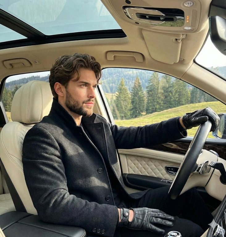 A highly structured prompt for generating a sophisticated editorial photograph of a young man in the driver's seat of a luxury SUV. It meticulously defines composition using the Rule of Thirds, a detailed color profile, high-contrast natural window lighting, and technical specifications to achieve a realistic, polished aesthetic conveying wealth and leisure.