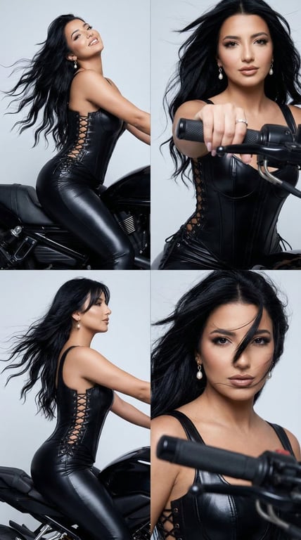 A highly detailed, structured JSON prompt for Nano Banana Pro designed to create a 2x2 grid of a woman in a black latex catsuit with a motorcycle, focusing on high-fashion editorial realism, consistent identity, and specific poses within a luxury studio setting.