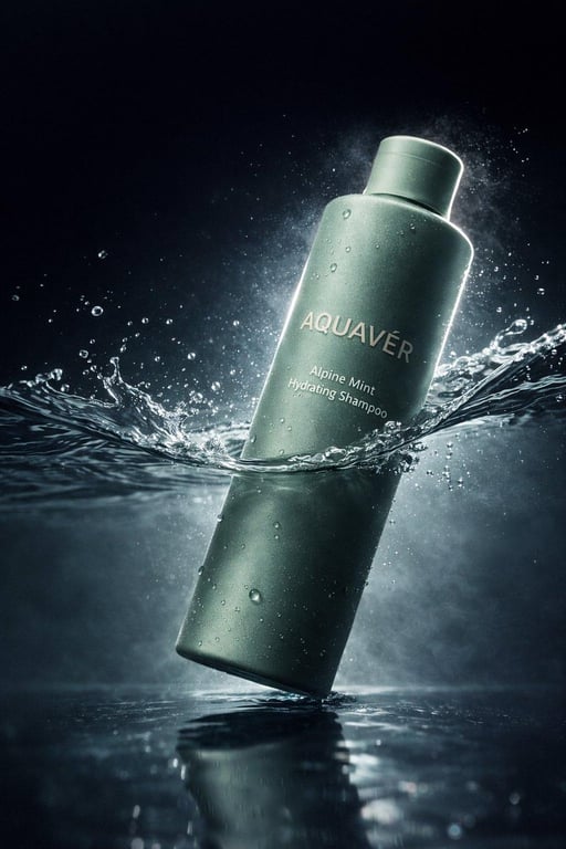 A prompt for generating an ultra-realistic, high-speed commercial image of a luxury shampoo bottle splashing through crystal-clear water. It emphasizes dynamic liquid motion frozen mid-air, cinematic studio lighting with cool blue tones, and high-speed photography techniques to achieve a premium skincare advertising style in 8K resolution.