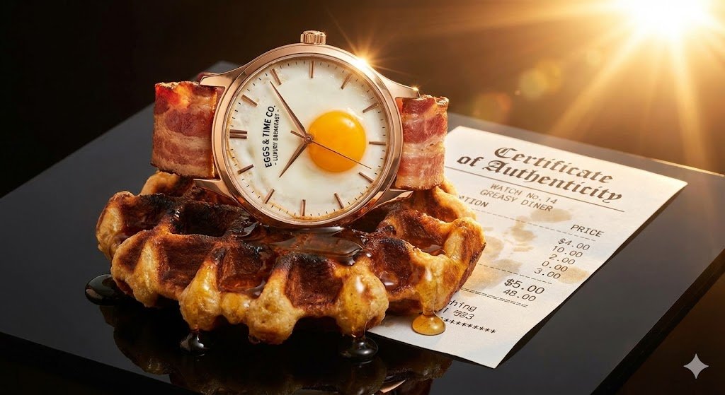 A structured prompt for generating product photography in an advertising world context, focusing on a luxury watch. The prompt uses 'core tension' (Luxury vs. Absurdity) and 'twist mechanisms' (functional mismatch, material displacement, shape mutation) to create a visually striking and humorous image, set on polished black acrylic with strong backlighting.