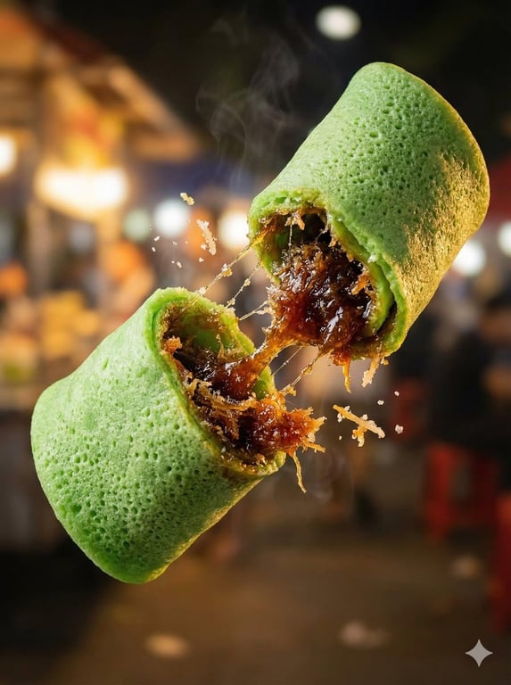 A prompt for generating an ultra-realistic macro photograph of a crispy dessert or snack split mid-air, with gooey filling stretching between the halves, set against a night market background with warm bokeh lights.