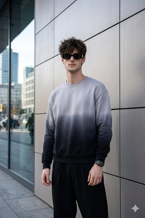 A prompt for generating a masterpiece 8K cinematic portrait of a stylish man, ensuring 100% identity match to a reference image, standing against a modern architectural wall, wearing a gradient sweatshirt and dark sunglasses.