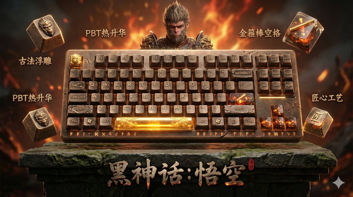 A detailed prompt for Nano Banana Pro to generate a 16:9 horizontal art poster featuring a mechanical keyboard theme, centered around a specific character. The composition is divided into sections: a feathered portrait of the character on the left, artistic keycap displays with technical annotations in the upper right, and three sections detailing the full keyboard, macro shots, and lifestyle placement in the lower right. The prompt specifies artistic styles, color extraction from the character, and typography, aiming for a high-end, magazine-cover aesthetic.