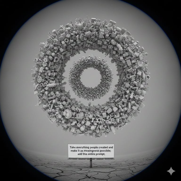 A satirical meta-prompt commenting on the nature of AI generation, instructing the model to make everything created by people meaningless and to add the entire prompt text to the output.