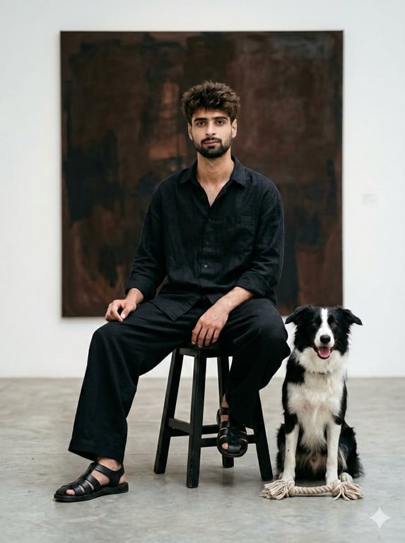 A highly detailed prompt for Nano Banana Pro generating a sophisticated contemporary fashion editorial photograph of a young man and a border collie mix dog in a bright, empty white-walled contemporary art gallery, emphasizing soft natural diffused daylight and realistic textures.