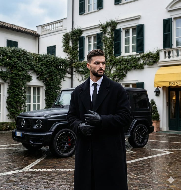 A highly structured prompt defining the composition, color profile, and lighting for a sophisticated, high-contrast editorial photograph. The scene features a subject in deep black attire and a black luxury SUV against a pure white architectural background, aiming for a moody, 'Old Money' aesthetic with detailed technical specifications.