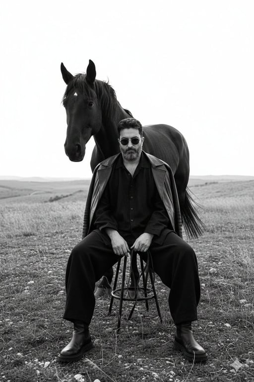 A detailed text prompt for generating a monochrome fine art fashion editorial image. It features a figure sitting low on a minimalist stool on rough terrain, wearing dark, oversized layered clothing and sunglasses, with a strong black horse standing protectively behind them. The prompt emphasizes high contrast, deep blacks, matte texture, and a medium format film look with subtle grain.