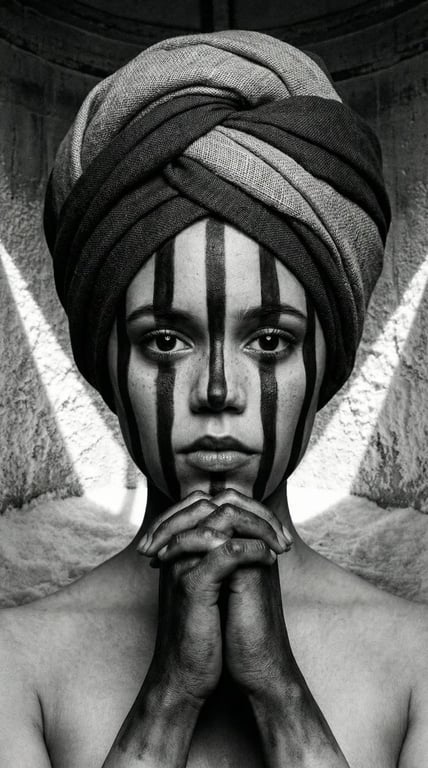 A complex, structured prompt for a hyper-realistic, monochrome fashion portrait in the style of avant-garde tribal brutalism, featuring high-contrast chiaroscuro lighting and heavy film grain, set inside a weathered salt silo.