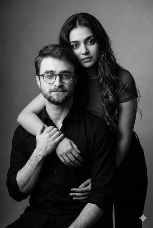 A detailed image generation prompt for a black and white, ultra-realistic fine art studio portrait of a couple. It specifies the mood (moody, intimate), the subjects (Hollywood actress and a seated man with glasses/beard), their pose (woman standing behind, wrapping arms around the man, hands clasped), and the lighting (soft dramatic studio lighting with deep shadows).