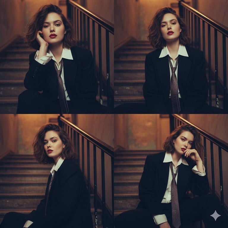 A very detailed JSON-style prompt describing a moody, cinematic 2x2 collage of the same young woman on an old stairway, with specific poses, lighting, and camera settings for an editorial look.