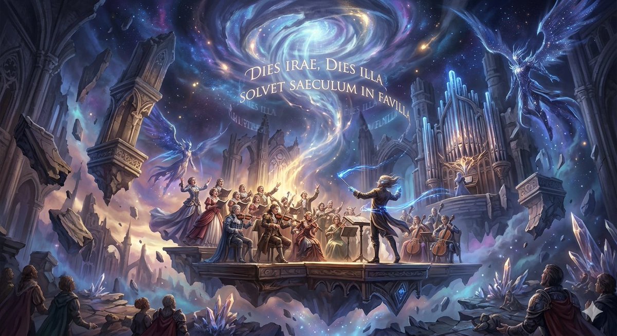A prompt for Nano Banana Pro (Gemini 3 Pro Image) to generate an image based on Mozart's Requiem in D minor, K.626, specifically the 'Dies Irae' (Day of Wrath).