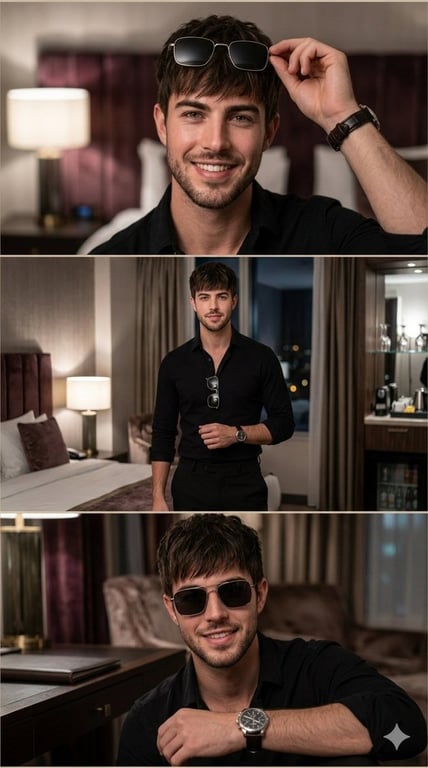 A detailed prompt for Nano Banana Pro on the Gemini app, requesting a cinematic, multi-frame lifestyle portrait of a stylish young man in a luxury hotel room. The prompt specifies a three-panel composition, detailed styling, warm ambient lighting, and an editorial fashion photography aesthetic.