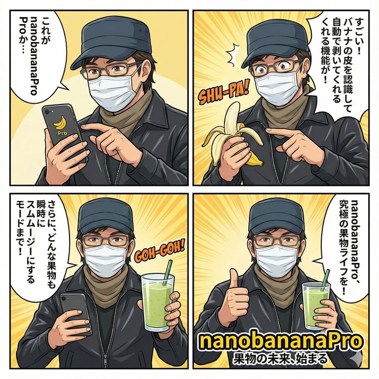 A prompt instructing an AI to create a four-panel comic strip explaining the 'Nano Banana Pro' product, utilizing a specified character for the illustration.