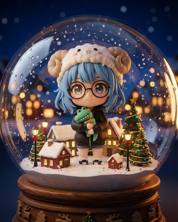 A detailed prompt for Nano Banana Pro that converts an uploaded image (either a real photo or an existing character) into a 2-head-tall super-deformed chibi character, renders it as a small 3D figure, and places it inside a glass snow globe with a miniature snowy town and Christmas lighting bokeh background.