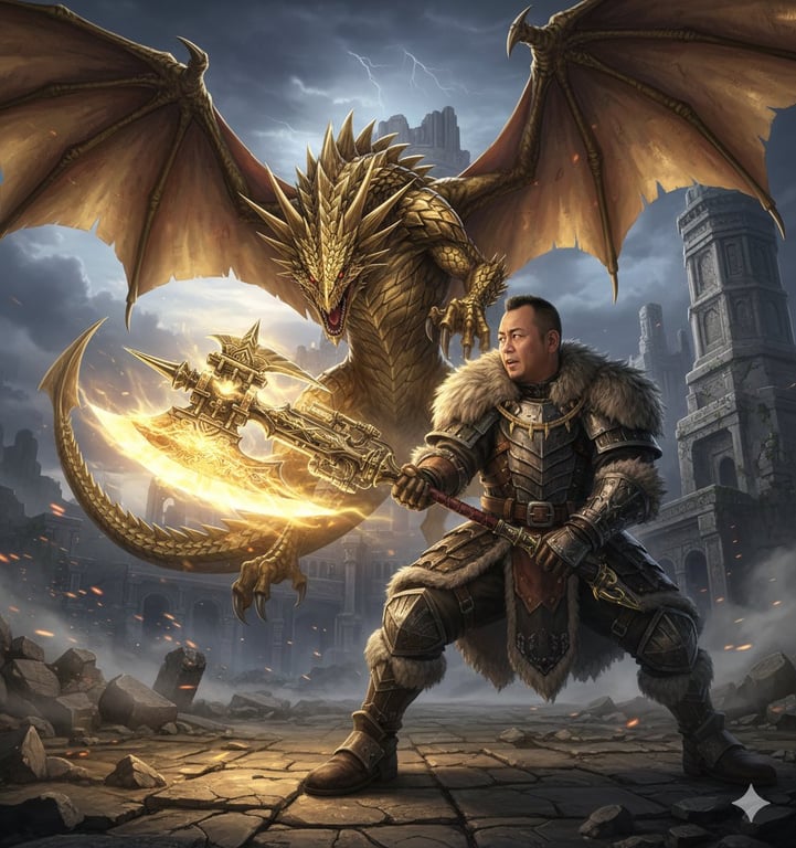 An image generation prompt for Nano Banana Pro (Gemini 3 Pro Image) requesting a battle scene set against the Monster Hunter tower background, featuring a person (Nishimura Mizuki) fighting Gold Rathian with a Slash Axe, and the axe glowing with a golden aura.