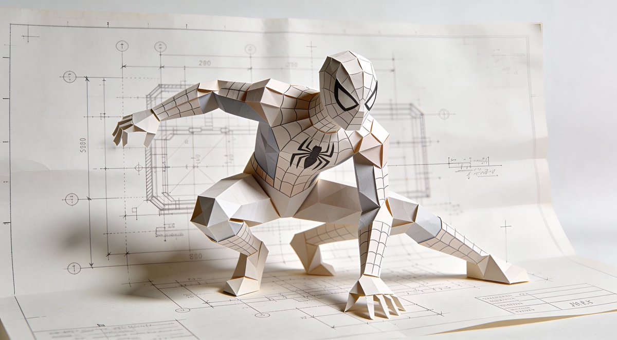 A natural language prompt for Nano Banana Pro requesting a hyper-detailed image of Spider-Man constructed from folded paper, resembling an architectural blueprint with geometric folds, measurement lines, and a minimal color palette.