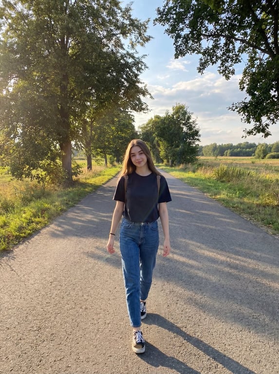 A JSON prompt for generating a photorealistic, full-body lifestyle portrait of a young woman walking on a quiet country road during golden hour. The prompt specifies natural lighting, casual attire (black t-shirt, denim jeans), and a peaceful, fresh mood.