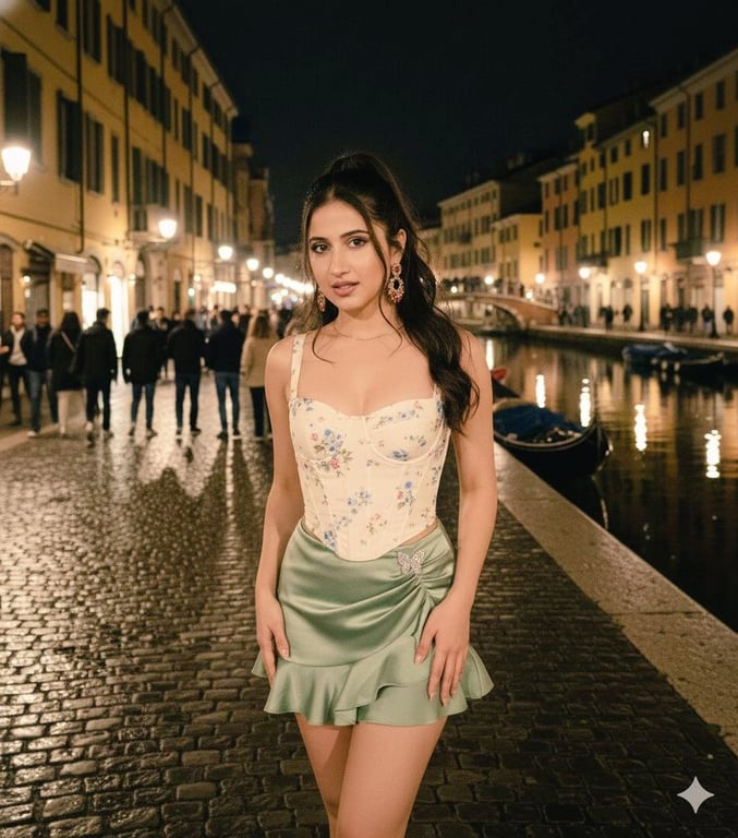 A structured prompt for generating a vertical night photograph of a young woman posing by a city canal, likely in Italy. It details her outfit (floral corset top, sage green satin mini skirt with a silver butterfly embellishment) and the atmospheric setting (cobblestones, dark water reflections, street lamps, and blurred crowds).