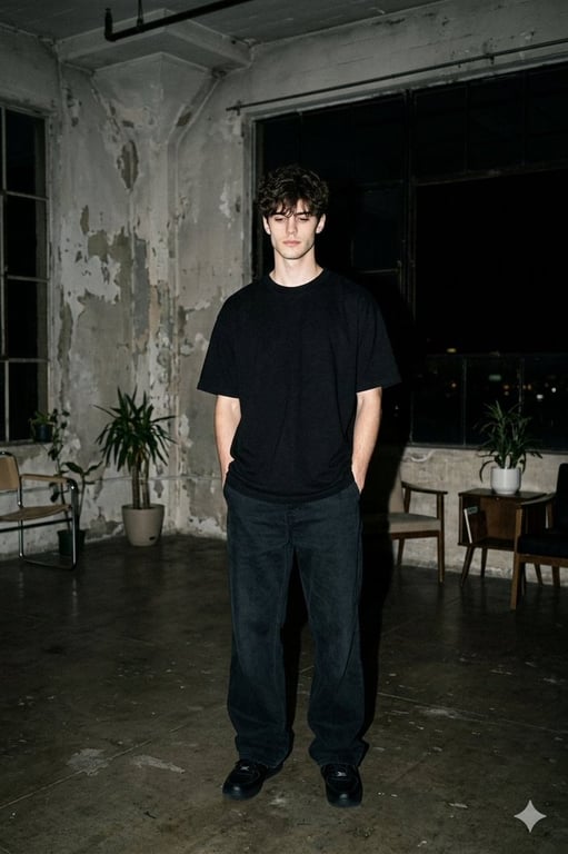 A prompt for generating a hyper-realistic, wide nighttime photograph in the style of early-2000s streetwear editorial photography shot on 35mm film. It features a young model in an oversized black t-shirt and wide-leg trousers inside a worn industrial loft, utilizing harsh direct on-camera flash to create dramatic shadows and highlights.