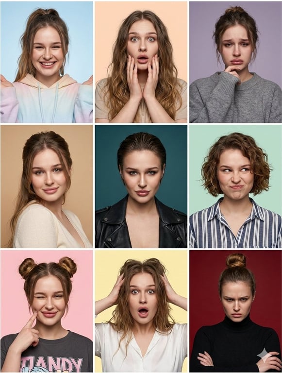 A complex JSON prompt designed to generate a 3x3 grid collage of nine hyper-realistic portraits of the same person, each displaying a different expression, pose, outfit, and background color, while strictly maintaining the identical facial structure across all panels (identity lock).