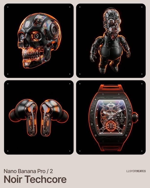 A highly structured, detailed prompt designed for Nano Banana Pro to generate hyper-realistic, noir techcore product photography. It specifies strict composition rules, dramatic rim lighting with orange and amber glow, and a long list of negative constraints to ensure a clean, professional void atmosphere.