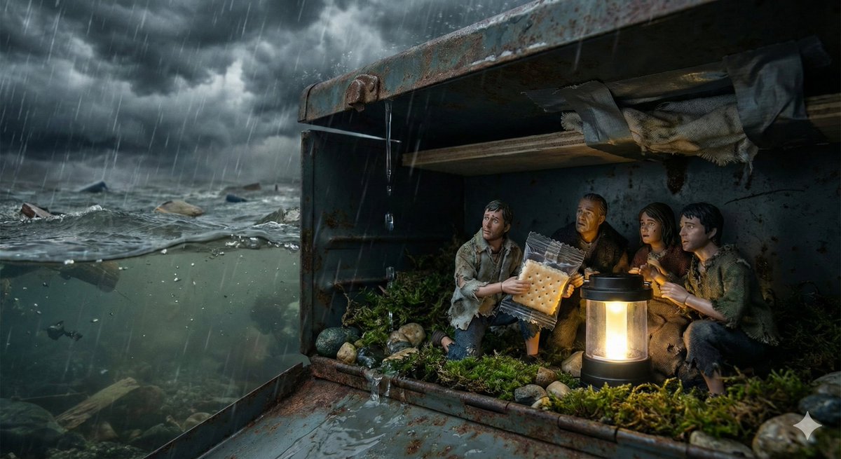 A conceptual prompt for generating a dramatic scene where an ordinary object is used as a desperate refuge by tiny human beings during a raging catastrophic storm. The prompt emphasizes claustrophobic interior lighting, visible storm elements through gaps, and the emotional tension of deciding whether to stay or flee.