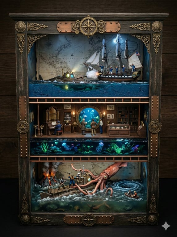 A highly structured, variable-driven prompt template for generating an ornate box diorama based on Jules Verne's 'Twenty Thousand Leagues Under the Sea'. The prompt uses variables for theme, materials, style, and scene descriptions across three shelves, along with strict directives for framing, composition, and lighting to ensure a miniature scale aesthetic.