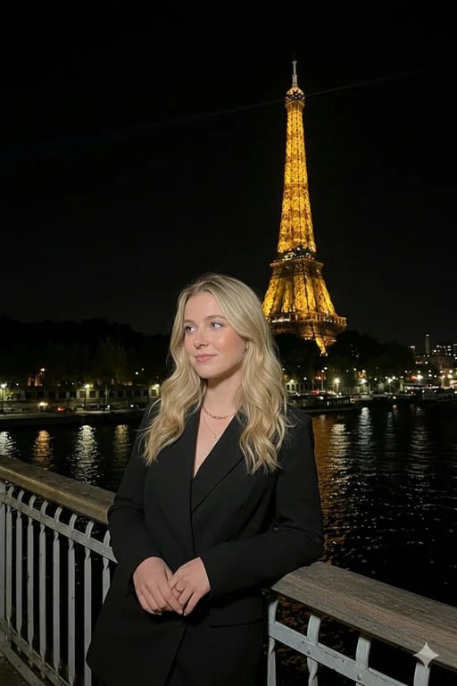 A detailed JSON prompt for generating a vertical flash photography shot of a woman leaning on a railing in Paris at night. It specifies the Eiffel Tower glowing gold in the background, hard drop shadows from the direct flash, high contrast, and a realistic, influencer travel aesthetic, shot on 35mm film.